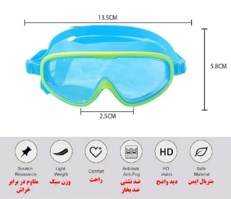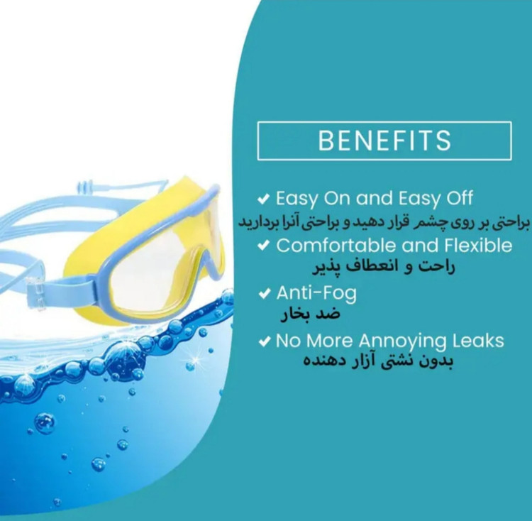 ✔️به دلیل بندهای قابل تنظیم که در دوطرف عینک قرار دارد روی صورت کاملا فیکس میشود که مانع ورود آب وکلر به چشم کودک و سبب جلوگیری از سوزش در چشم کودکان میشود