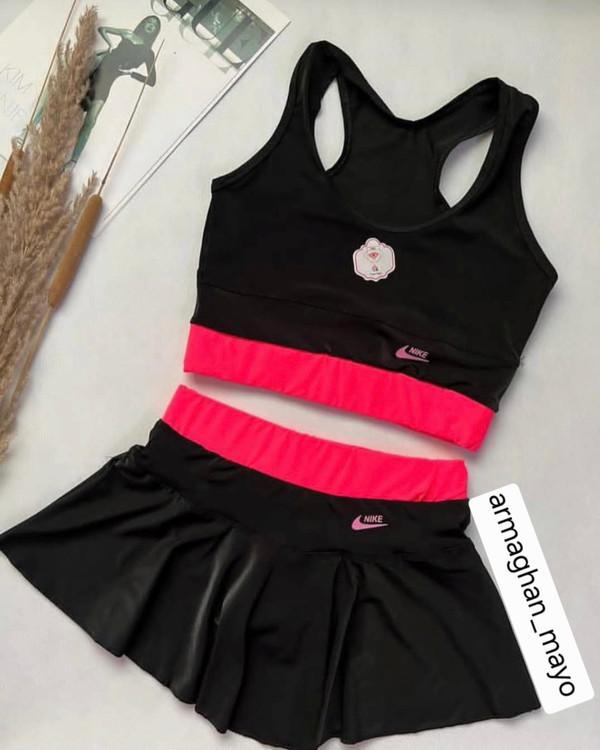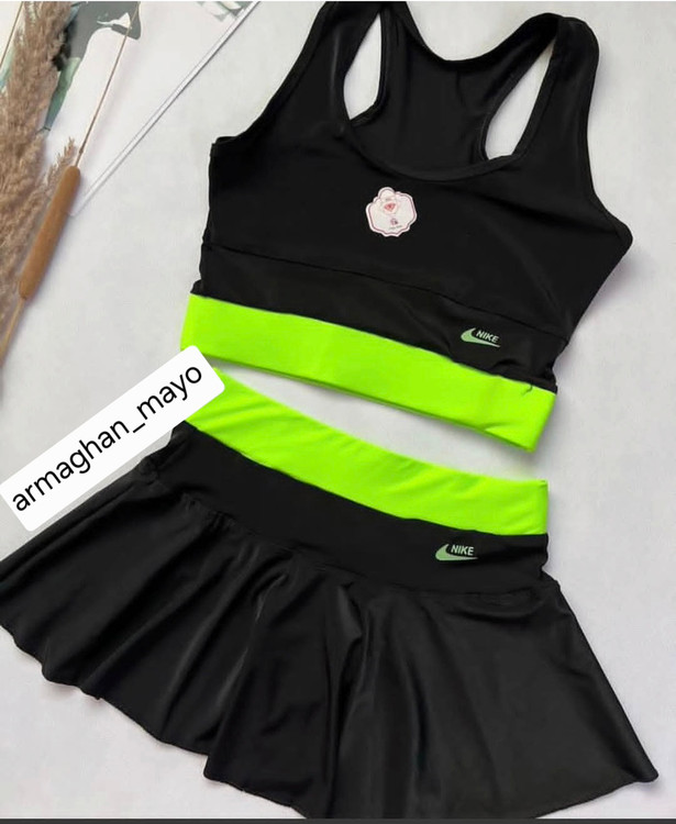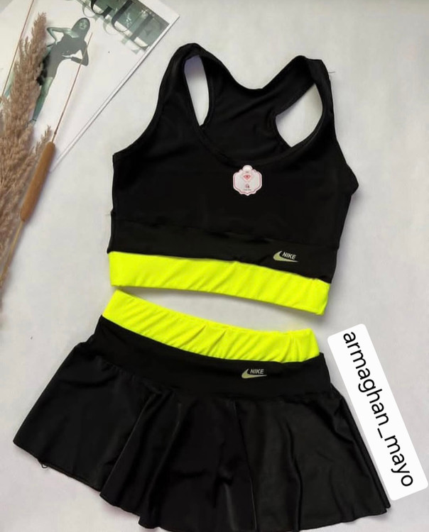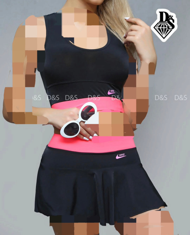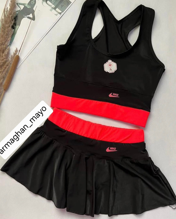 طراحی دامنی و نوارهای رنگی جلوهای مدرن و اسپرت ایجاد میکند و تنخور خوشفرم بالاتنه را نشان میدهد.