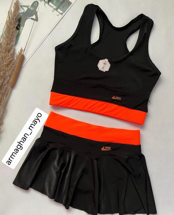 مایو دوتیکه دامنی مشکی با نوارهای رنگی، انتخابی شیک و جذاب برای خانمها و دخترخانمها